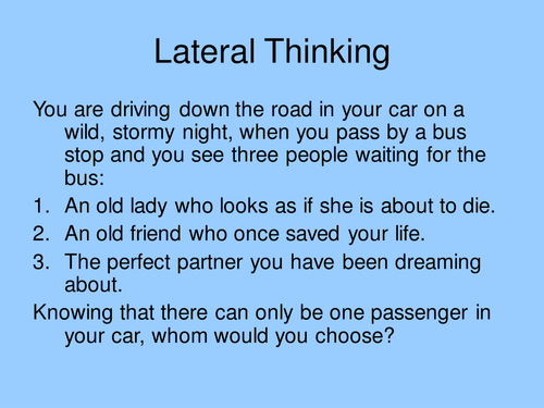 We know that it's a way convenient to roll and move matches with a finger or a mouse click. Home >> top 10 lateral thinking puzzles lateral thinking puzzles are strange situations in which you are given a little information and then have to find the explanation. On this page are lots of clever riddles, puzzles, lateral thinking puzzles, trick questions, number puzzles, logic puzzles and word games, all which can be used for team building exercises or party games. 18 july danny ocean break safe puzzle. Such puzzles intend to check your analytical and problem solving abilities. If the scale does not tip, you know that the 6 coins on the scale are legitimate, and the counterfeit is in the pile in front of you. Lateral thinking riddles are puzzles that combat against any preconceived notions or ideas you may have already drilled into your psyche. This set contains 10 easy logical and analytical puzzle questions. To find the right answer to a mind teaser, we have to exercise something called lateral thinking. Hard find three mistakes in the picture can you spot three mistakes in the below. However, there is often one best solution for each puzzle. These tricky questions are also called thinking riddles because they force readers to think outside of the box to get the correct answer. The higher the number the stronger the poison.